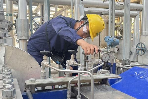 “每天至少巡4遍责任区,参数波动0.1都得弄明白。”朱宸峰回忆说。去年氢气断供重启的关键时期,冷却循环水泵因循环水气化突发故障,若不及时处理,将直接影响整条生产链条的稳定。他与同事迅速组成应急小组,分工协作,一人驻守四楼泵出口,紧盯压力变化,另一人在一楼泵入口,精准操作排气阀排除气体。同时,两人通过对讲机与主控室实时联动,同步调整操作策略。一个多小时里,他们全程专注、无缝配合,最终成功让水泵恢复运转,牢牢守住了生产链条的稳定。